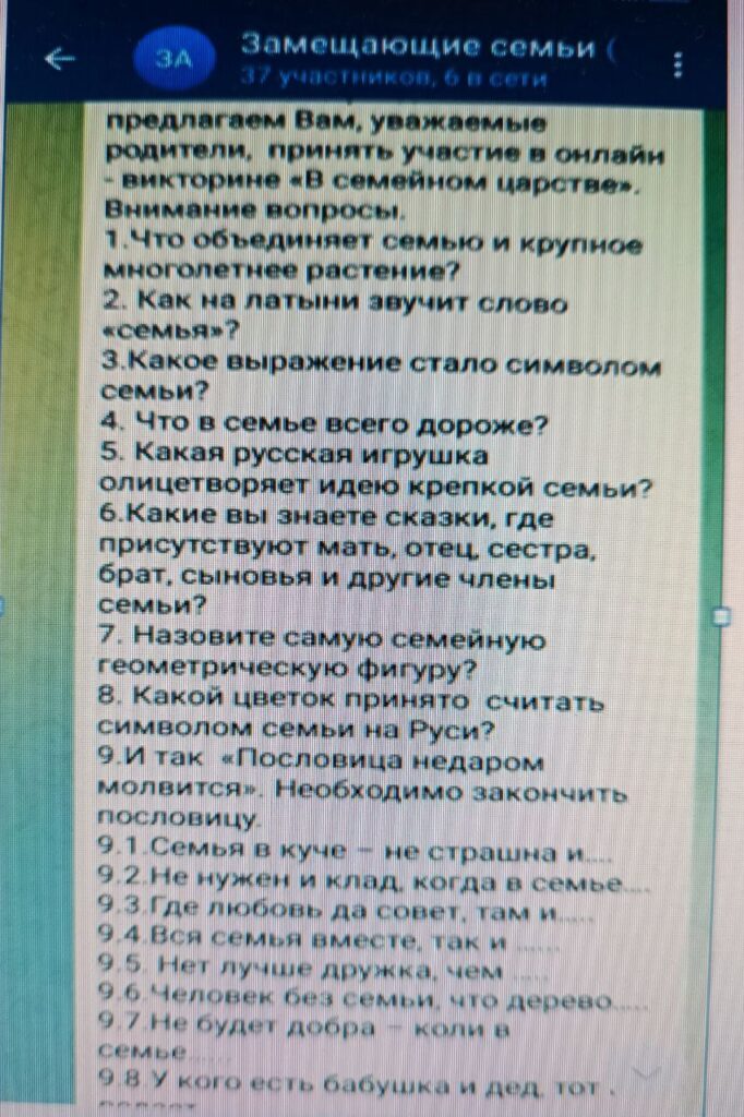 Специалисты отделения сопровождения замещающих семей провели с замещающими родителями онлайн – викторину «Семейное царство» в целях укрепления статуса института семьи, важности семейных уз, сохранения и развития семейных ценностей и традиций.